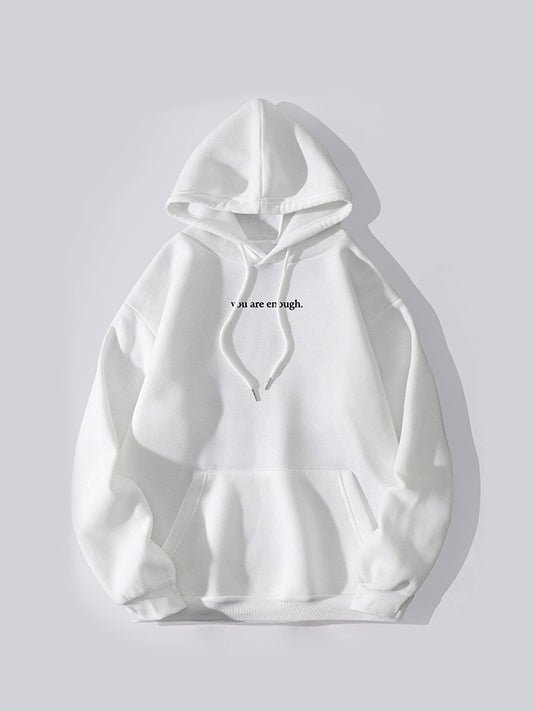 White Oversized Kangaroo Pocket Drawstring Hoodie with Letter Print