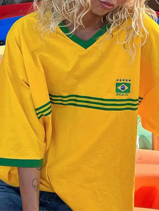 T-shirt à manches courtes brodé surdimensionné vintage jaune