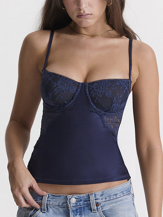 Camisole en dentelle vintage noire avec col en V et nœud en dentelle