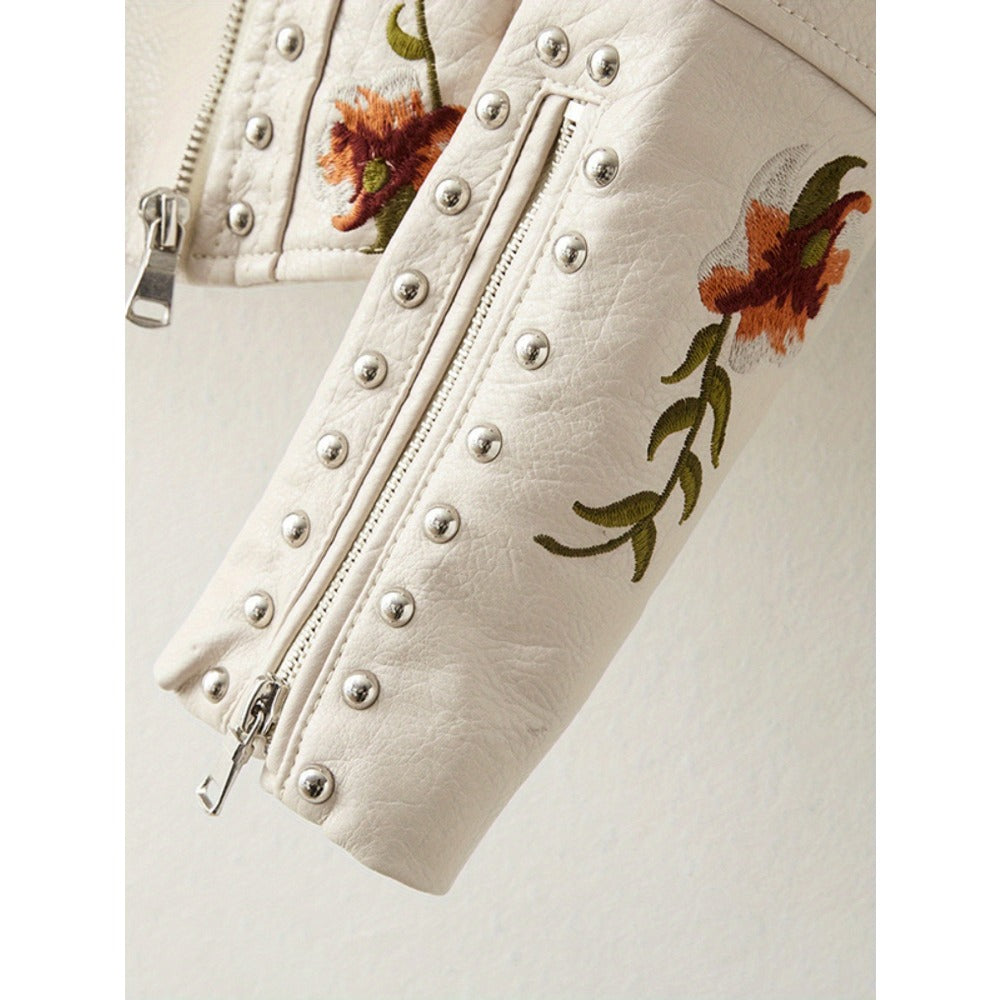 Cette veste beige en similicuir allie une silhouette motarde moderne à une délicate broderie florale pour une touche de fraîcheur et d'élégance. Conçue pour les femmes qui apprécient les vêtements d'extérieur affirmés, elle allie structure et charme, ce qui en fait un choix idéal pour se superposer à une variété de tenues.
