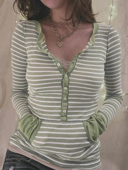 Groene vintage gestreepte geribbelde gebreide top met knopen aan de voorkant