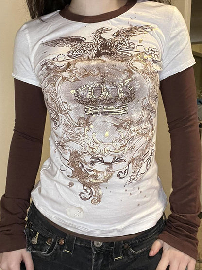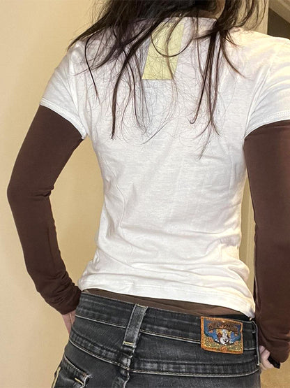 Contrast Color Gothic Print Splice Mock Two Piece Long Sleeve Top