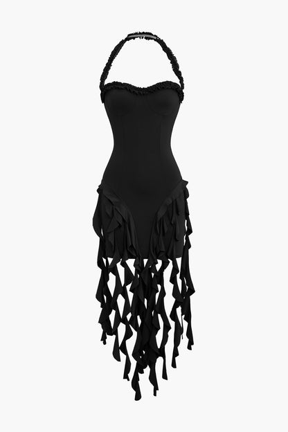 Solid Color Ruffle Tassel Halter Bustier Mini Dress